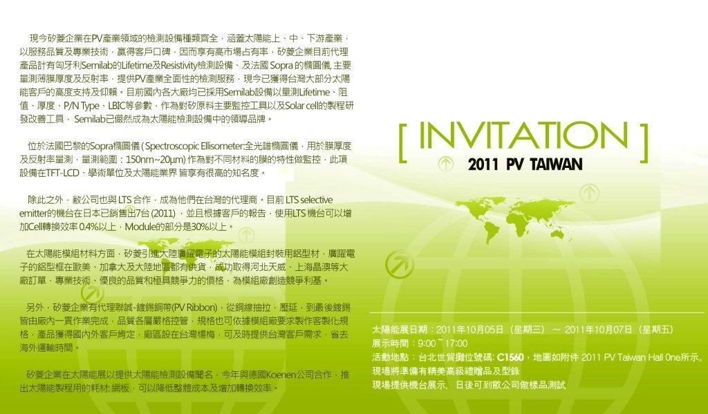PV Taiwan整合外貿協會與SEMI在展覽及國際行銷的專業經驗和產業資源,為台灣規模最大的太陽光電展會。2010年,PV Taiwan共有來自全球251家重要太陽光電廠商展出626個攤位,吸引超過11,437名參觀者到場。本展提供最具效益的專業採購平台,展出優質的台灣太陽光電產品及全球太陽光電相關製造設備與材料,並搭配專業論壇,完整呈現台灣光電產業創新研發技術能量,是您一定要參加的台灣太陽光電產業年度盛會!